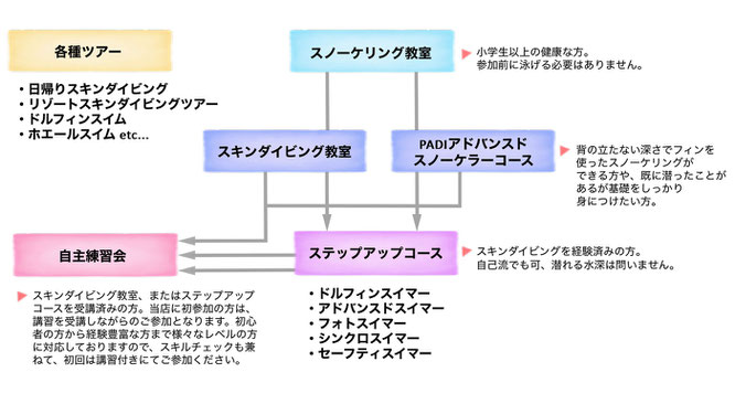 スノーケリング教室、スキンダイビング教室、ステップアップコース、レベル別でのクラスを開催しています。段階を分けて開催することで、より適した内容でご受講いただけます。
