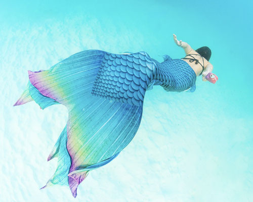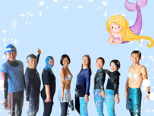 マーメイドコスチュームの他、まだマーメイドの資格をお持ちでない方のためにマーメイド柄レギンスやアイテム着用でのご参加も受付中。レギンス等は無料レンタルが可能ですが、マーメイドコスチュームやレギンスでなくてもご参加いただけます。マーメイドに興味のある方もない方も、ご自身のスキルに合わせて楽しくご参加ください。