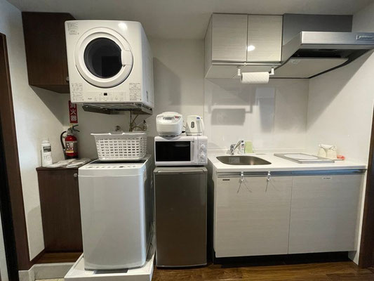 お部屋の設備:テレビ、エアコン、Wi-Fi、冷蔵庫、洗濯機、乾燥機、ドライヤー、電子レンジ、デッキポット、調理器具含むキッチン用品各種