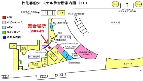 建物中央付近から奥に続く道(島しょ船受付窓口:乗船券販売所とSHOP竹芝の間)に入り、自販機コーナー前の四角い柱の付近にお越しください。